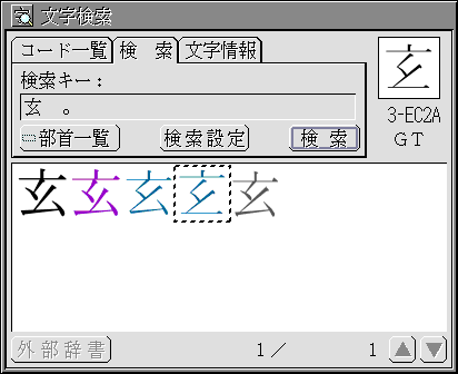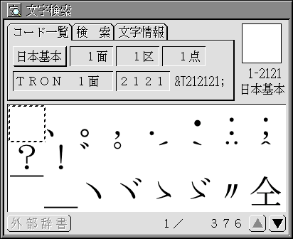 - 「コード一覧」、「検索」や「文字情報」の見出しで引きたい文字を探し、選択状態(ちらつき枠に囲まれた状態)にします。
