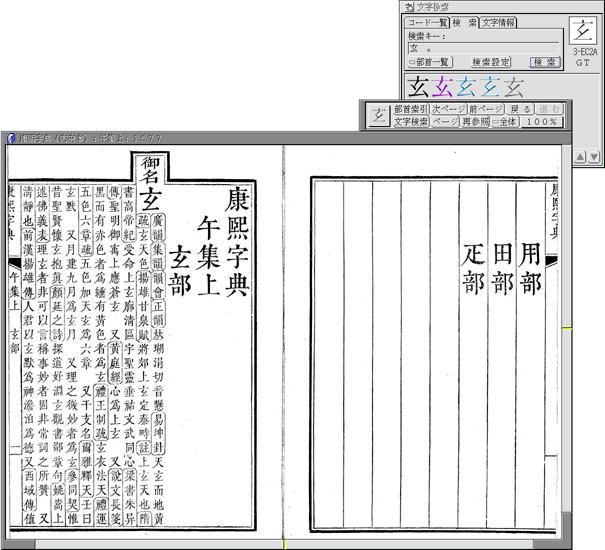 選択した文字が康煕字典に含まれるときは、康煕字典のウィンドウが現れ、選択した文字の載ったページが開かれます。