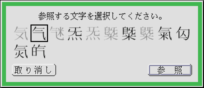 - 選択した文字が康煕字典に含まれないときは、その文字の関連字の一覧のパネルが現れます。パネルの関連字の中から、参照したい文字をクリックして、[参照]スイッチをクリックします(薄く表示された文字は康煕字典に含まれない文字です)。