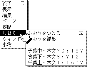 † しおりが20個まで登録してあると、[しおり]メニュー[しおりをつける]が薄く表示され、これ以上しおりをつけることができなくなります。この場合は[しおり]メニューの[しおりを編集]を選んで、不要なしおりを削除してください。