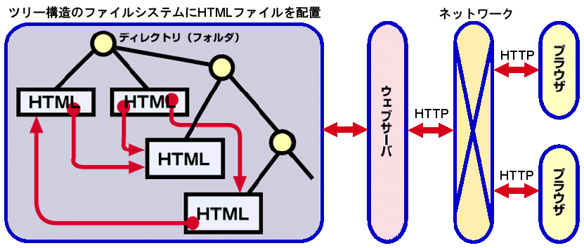 ウェブブラウザは、インターネットを通してウェブサーバに対して“どこそこのHTMLファイルが欲しい”と要求を出す。この要求はHTTP(Hypertext Transfer Protocol)の規格に従っている。ウェブサーバはこの要求を受け付け、指定されたHTML文書をブラウザに返す。ブラウザは、受け取ったHTMLファイルをレイアウトしてウィンドウ内に表示する(図2右)。