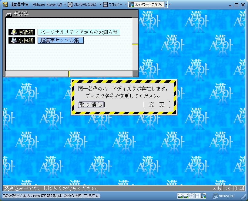 - デスクトップにある「超漢字V」のアイコンをダブルクリックし起動すると、「同一名称のハードディスクが存在します。ディスク名称を変更してください。」と表示される場合があります。