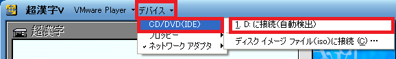 - VMware Playerのツールバーにある[デバイス]-[CD/DVD(IDE)]-[1.D:に接続(自動検出)]をクリックします。