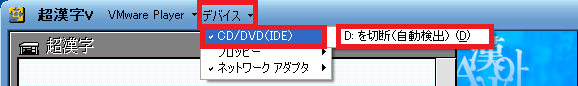 - VMware Playerのツールバーにある[デバイス]-[CD/DVD(IDE)]-[1.D:を切断(自動検出)]をクリックします。