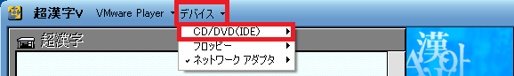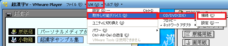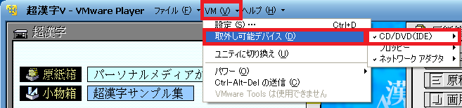 - VMware Playerのツールバーにある[VM]-[取外し可能デバイス]-[CD/DVD(IDE)]の左側にチェックが入っている場合は、CD-ROMは接続状態になっています。