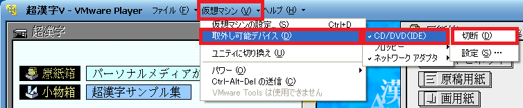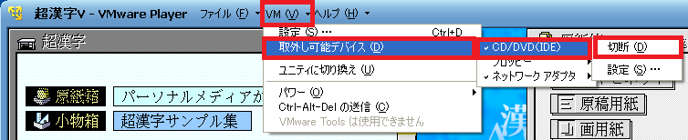 - VMware Playerのツールバーにある[VM]-[取外し可能デバイス]-[CD/DVD(IDE)]の左側にチェックが入っていない場合は、CD-ROMは切断状態になっています。