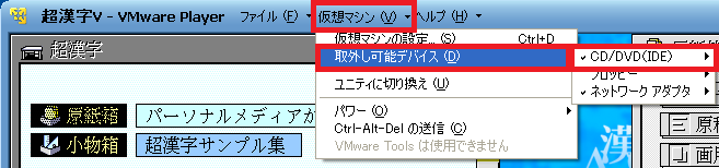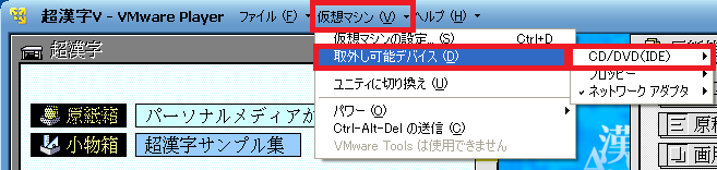 - VMware Playerのツールバーにある[仮想マシン]-[取外し可能デバイス]-[CD/DVD(IDE)]の左側にチェックが入っている場合は、CD-ROMは接続状態になっています。