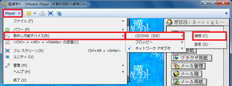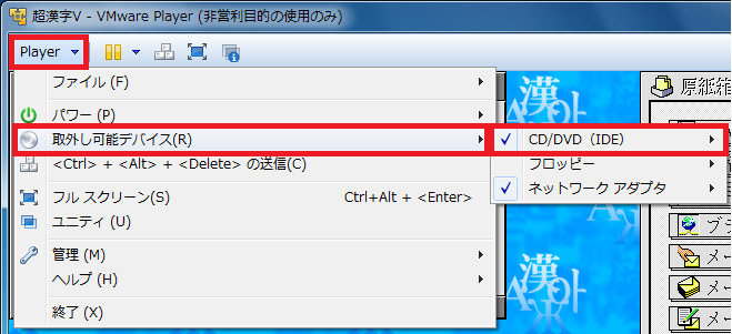 - VMware Playerのツールバーにある[Player]-[取外し可能デバイス]-[CD/DVD(IDE)]の左側にチェックが入っている場合は、CD-ROMは接続状態になっています。