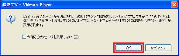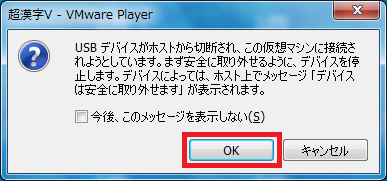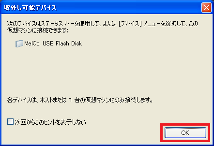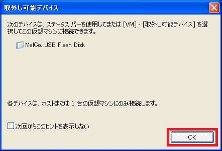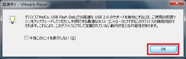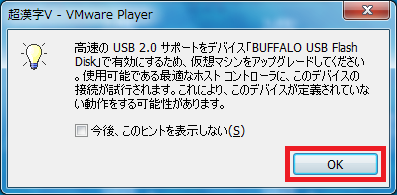 注意:VMware Playerインストール後、初めてUSBメモリ等USB機器を利用する場合は、VMware USB Deviceをインストールするため、USBメモリ等USB機器が接続状態になるのに時間がかかる場合があります。