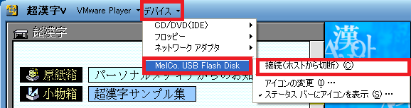 - VMware Playerのツールバーにある[デバイス]-[デバイス名](USB機器により名称は異なります)-[切断(ホストに接続)]をクリックします。