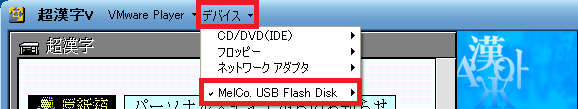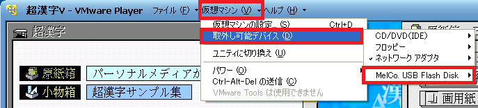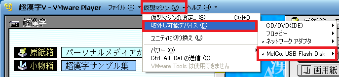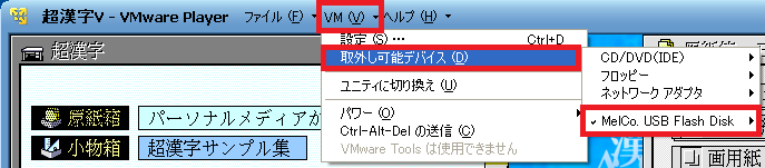 - VMware Playerのツールバーにある[仮想マシン]-[取外し可能デバイス]-[デバイス名](USB機器により名称は異なります)の左側にチェックが入っている場合は、USBメモリは接続状態になっています。