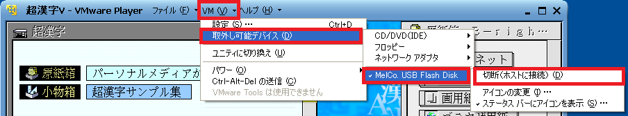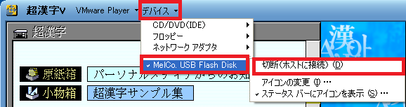 - VMware Playerのツールバーにある[仮想マシン]-[取外し可能デバイス]-[デバイス名](USB機器により名称は異なります)の左側にチェックが入っていない場合は、USBメモリは切断状態になっています。