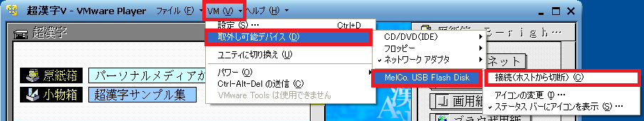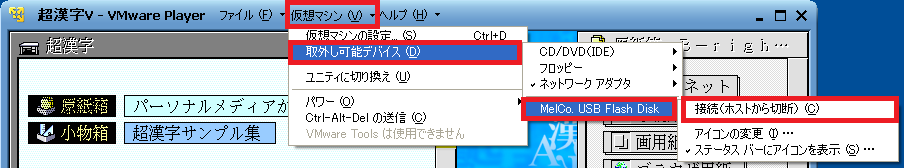 - VMware Playerのツールバーにある[VM]-[取外し可能デバイス]-[デバイス名](USB機器により名称は異なります)-[接続(ホストから切断)]をクリックします。