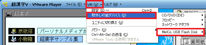 - VMware Playerのツールバーにある[VM]-[取外し可能デバイス]-[デバイス名](USB機器により名称は異なります)の左側にチェックが入っている場合は、USBメモリは接続状態になっています。