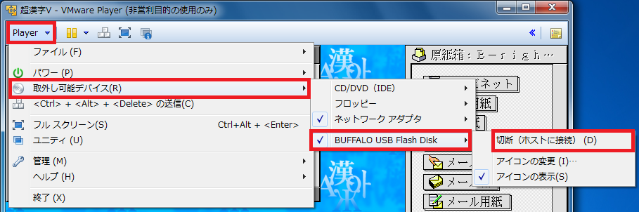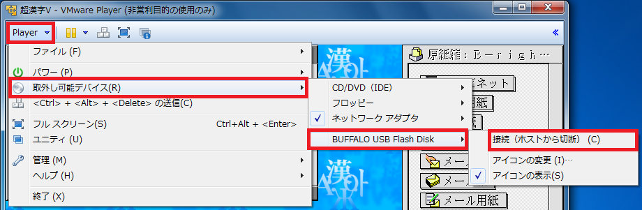 - VMware Playerのツールバーにある[Player]-[取外し可能デバイス]-[デバイス名](USB機器により名称は異なります)の左側にチェックが入っていない場合は、USBメモリは切断状態になっています。