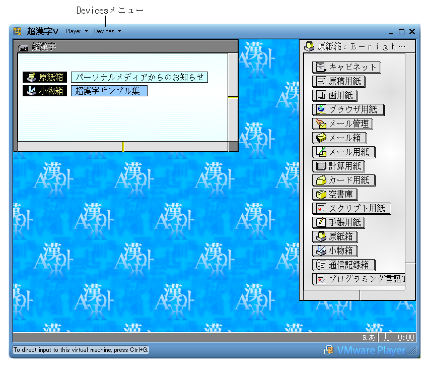 †VMware Playerのウィンドウの大きさを変えても、超漢字Vの画面サイズは変わりません。超漢字Vの画面サイズを変更したい場合は、[小物]メニューの[システム環境設定]で画面サイズを変更します。詳細は「画面サイズ/色数の設定」をご覧ください。