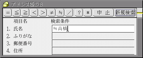 - 検索したい項目の「検索条件」欄の先頭に「≒」を入力します。