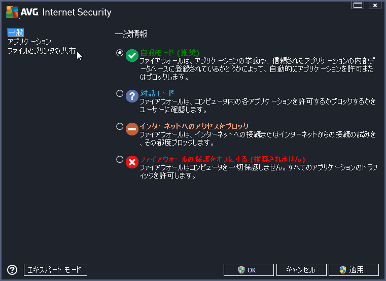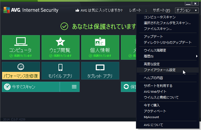 本文書は、「AVG インターネットセキュリティ 2014」を、同ソフトが内蔵する独自のファイアウォール機能を使う設定で利用している場合を前提としています。