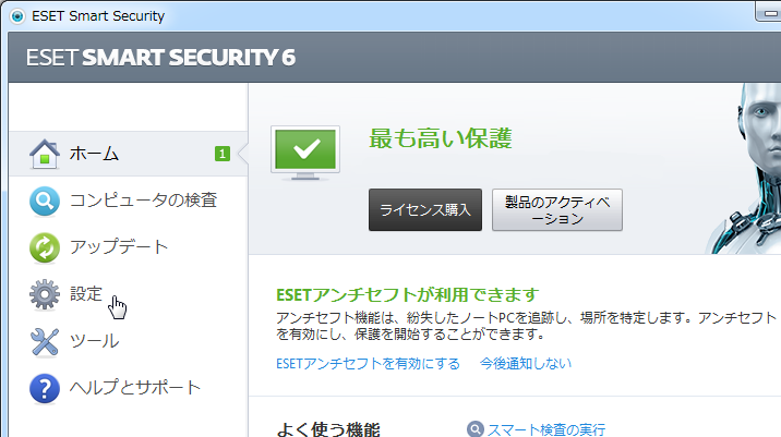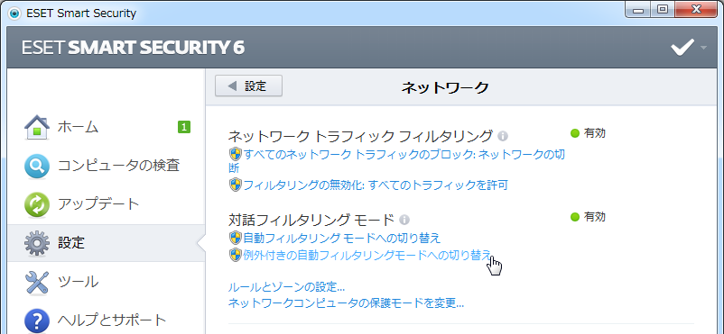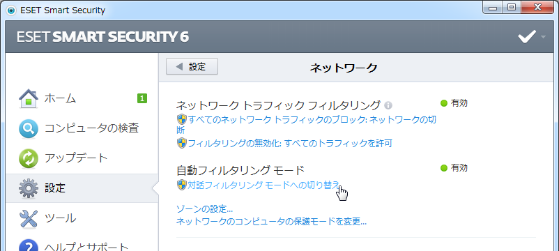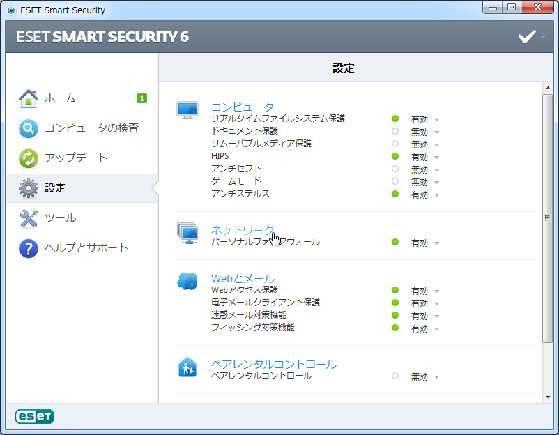 - 再度「ESET SMART SECURITY 6」を起動し、「設定」「ネットワーク」と順にクリックします。