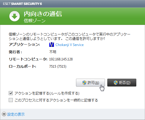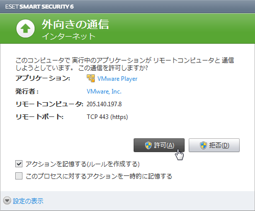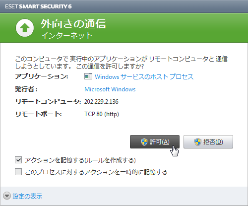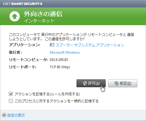 その間に、「ESET SMART SECURITY 6」がいくつか確認のパネルを表示しますので、「アクションを記憶する」にチェックを付け、「許可」をクリックしてください。