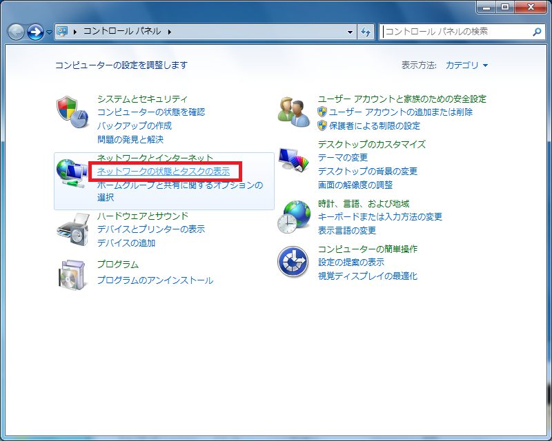 - [スタート]ボタンから[コントロールパネル]を選択し、「ネットワークとインターネット」にある「ネットワークの状態とタスクの表示」をクリックします。