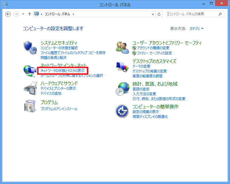 - コントロールパネルの「表示方法:カテゴリ」で、「ネットワークとインターネット」にある「ネットワークの状態とタスクの表示」をクリックします。
