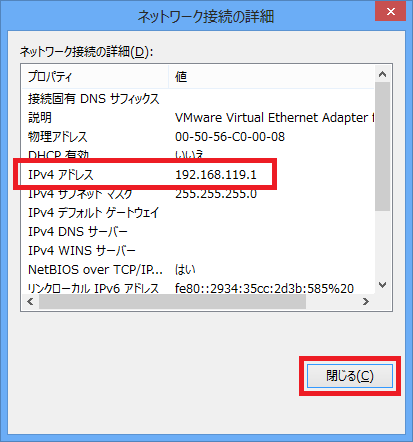 - 「IPv4 アドレス」の項目にあるIPアドレスがVMnet8のIPアドレスになります。この値をメモして、[閉じる]をクリックします。