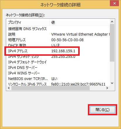 - 「IPv4 アドレス」の項目にあるIPアドレスがVMnet8のIPアドレスになります。この値をメモして、[閉じる]をクリックします。