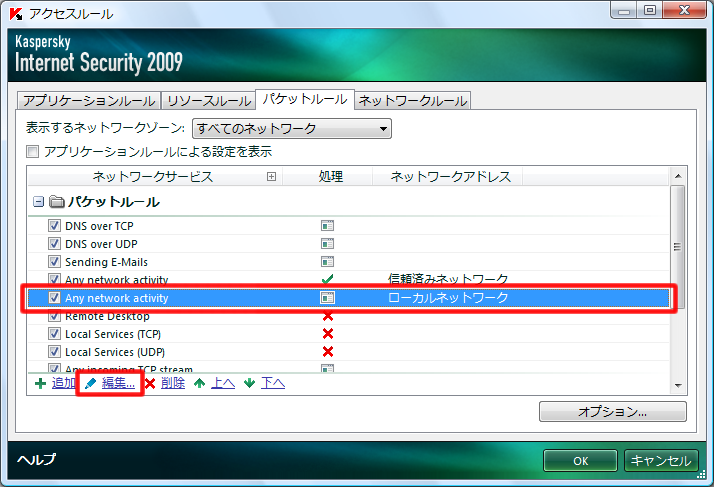 - 一覧の中から「Any network activity ローカルネットワーク」のルールを探してクリックし、[編集...] をクリックします。