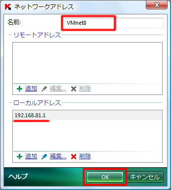 - 「ローカルアドレス」に VMnet8 のIPアドレスが追加されたことを確認し、「名前:」に「VMnet8」と入力してから、[OK] をクリックします。