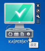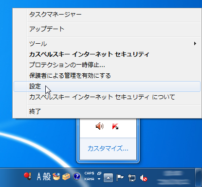 - タスクバーの右側にある「カスペルスキー・インターネットセキュリティ 2012」のアイコンを右クリックし、メニューの [設定] をクリックします。