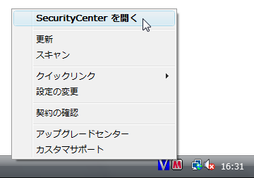 - タスクバーの右側にある「マカフィー」のアイコンをダブルクリックするか、右クリックして [SecurityCenter を開く] をクリックします。