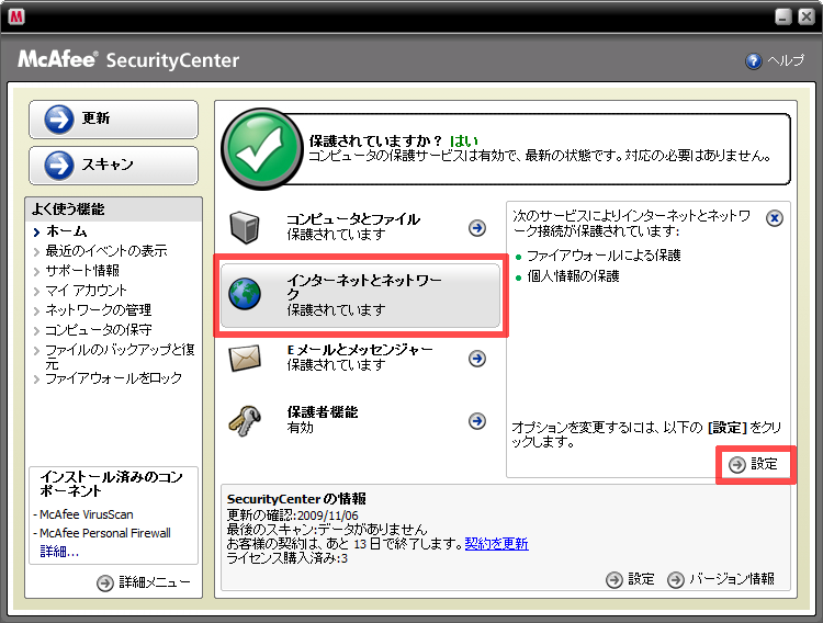 - 「SecurityCenter」の画面が現れます。「インターネットとネットワーク」をクリックすると、右側に 「設定」 ボタンが現れますのでクリックします。