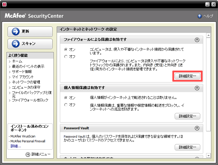 - 「インターネットとネットワークの設定」の画面が現れます。[ファイアウォールによる保護は有効です] の欄にある [詳細設定] をクリックします。