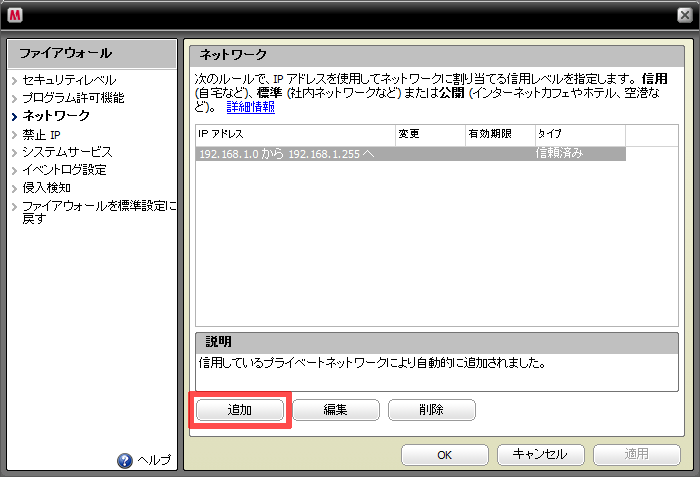 - 「ファイアウォール」の画面が現れます。左側の「ネットワーク」をクリックし、画面下の [追加] をクリックします。