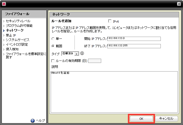タイプが「信頼済み」となっていることを確認し、説明には「VMnet8を追加」などの文字を入力してから、[OK] をクリックします。