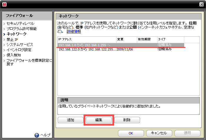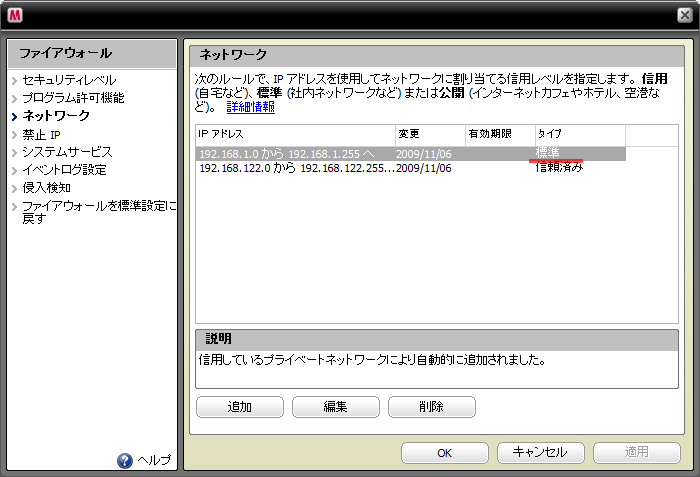 - 「ネットワーク」の画面に戻りますので、編集したルールのタイプが「標準」に変わっていることを確認します。