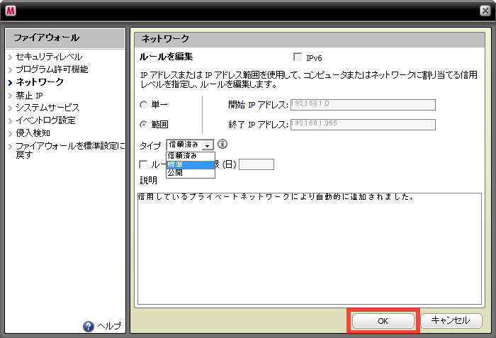 ただし以下の画面例では、「192.168.1.0 から 192.168.1.255 へ」が自動で追加されており、このままではネットワークの他のPCからも共有フォルダが見えてしまいますので、超漢字Vからのみに制限したい場合は、既存のルールを変更する必要があります。