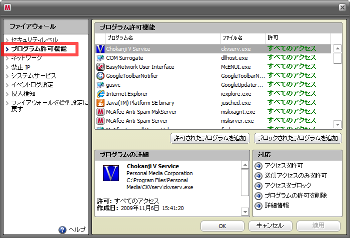 超漢字V:「マカフィー・トータルプロテクション 2010」の設定