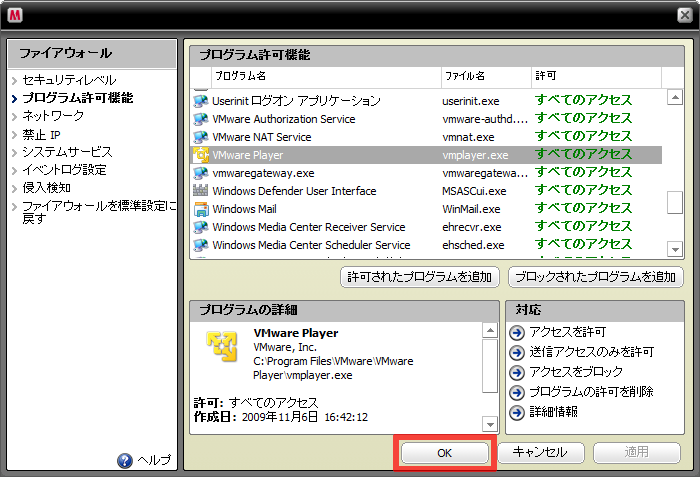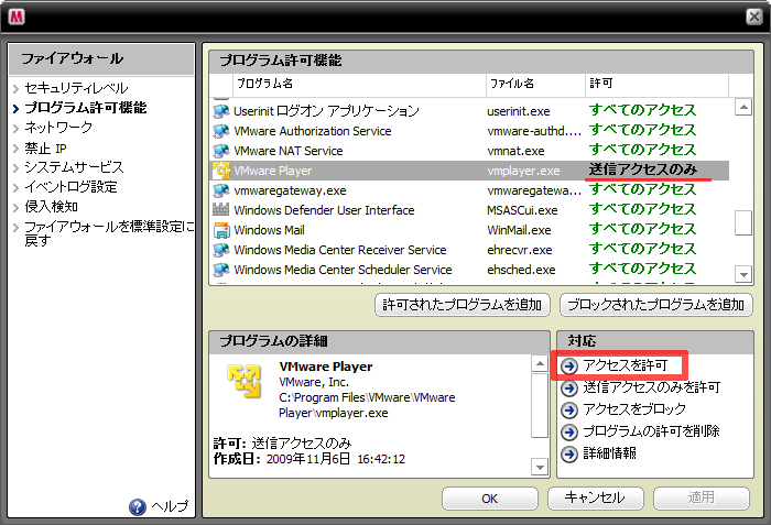 - 右側の「プログラム許可機能」欄から、以下のプログラム名を探し、「送信アクセスのみ」の設定になっているものがあれば選択し、「対応」欄の[アクセスを許可]をクリックして「すべてのアクセス」に変更します。