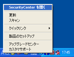 - タスクバーの右側にある「マカフィー」のアイコンを右クリックし、[SecurityCenterを開く] をクリックします。