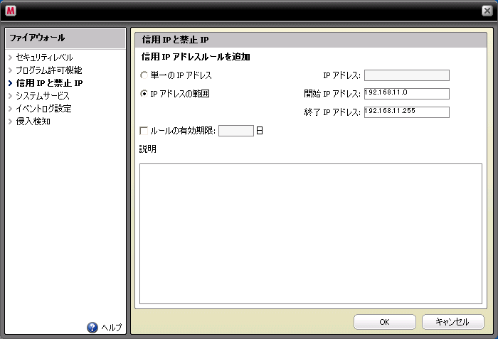 - 「信用IPアドレスルールを追加」の画面が現れます。まず[IPアドレスの範囲] にチェックを付けます。続いて、ステップ1で調べた VMnet8 の IP アドレスを元に、以下のように、「開始IPアドレス」と「終了IPアドレス」を入力します。