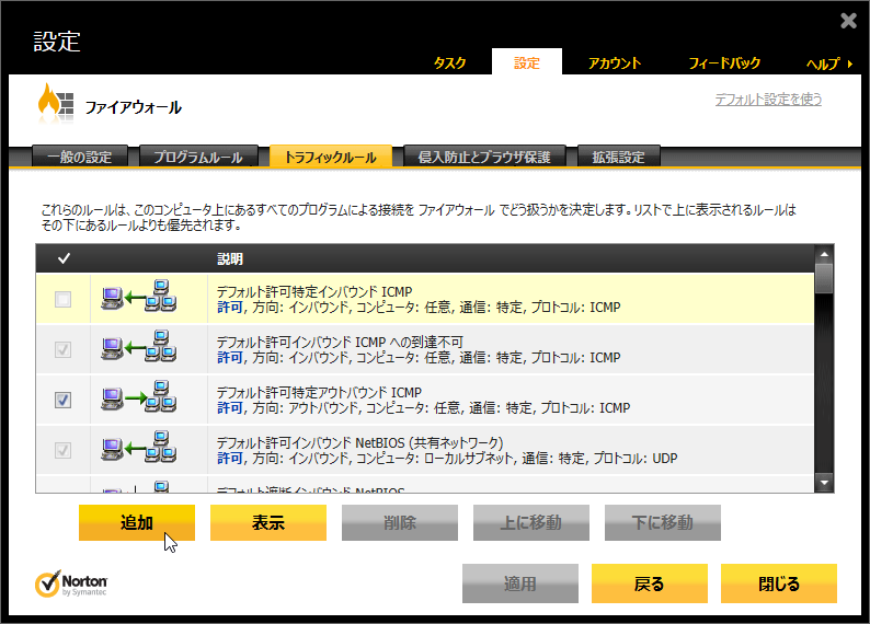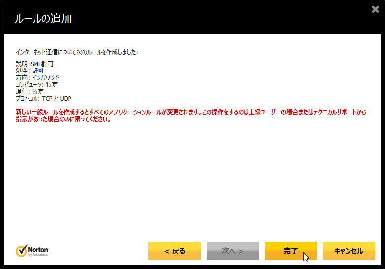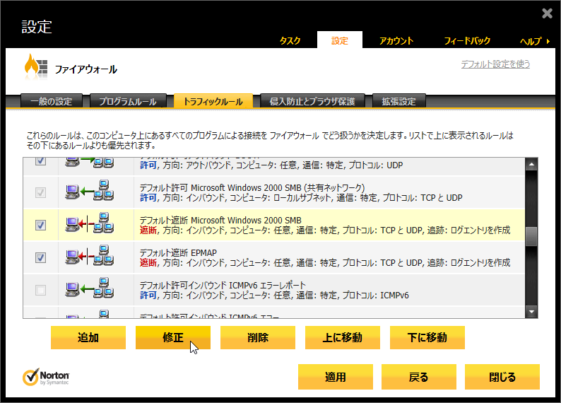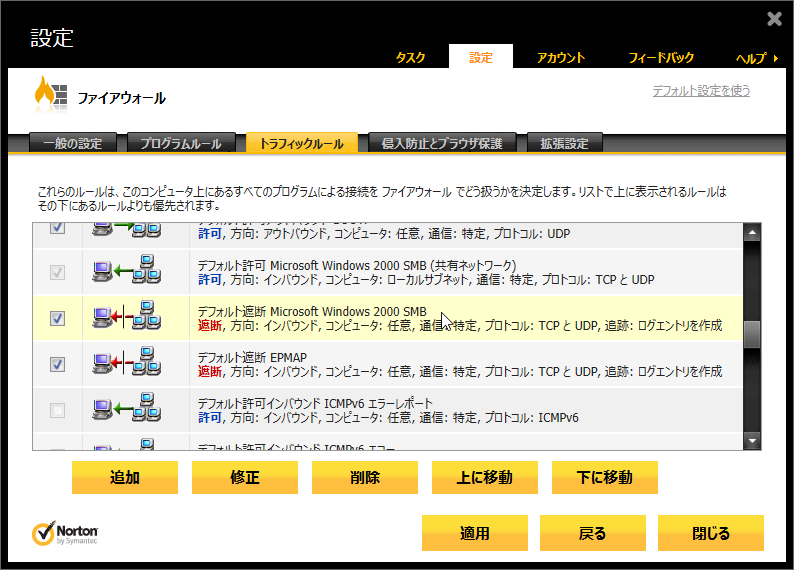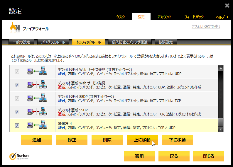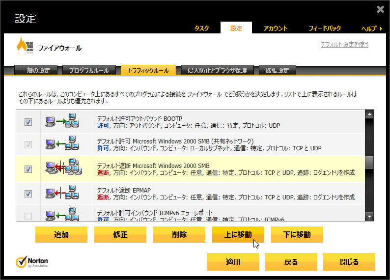 ![「デフォルト遮断 Microsoft Windows 2000 SMB」のルールを[上に移動]で上から2番目に移動](img/n360v2013_28s.png)