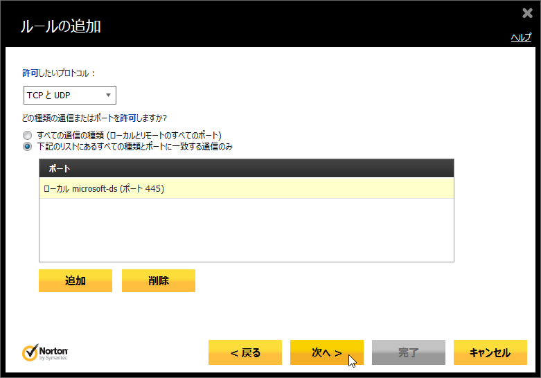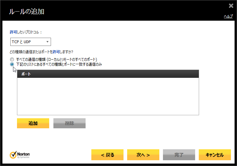 - 「許可したいプロトコル:」が「TCPとUDP」になっていることを確認(もしくは変更)し、「下記のリストにあるすべての~」の項目にチェックを付けます。