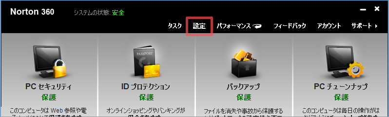 - 「Norton 360」のメインウィンドウが現れますので、中央上の[設定] をクリックします。
