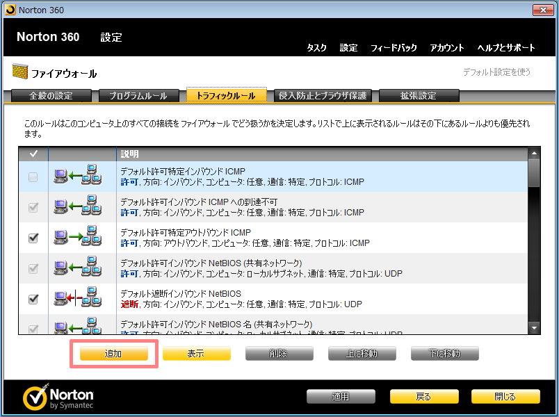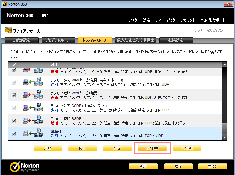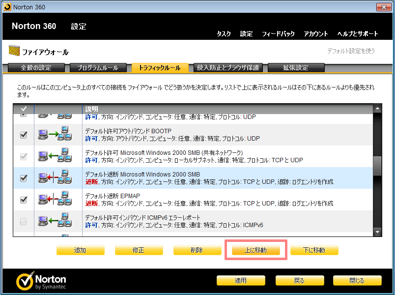 ![「デフォルト遮断 Microsoft Windows 2000 SMB」のルールを [上に移動] で上から2番目に移動](img/n360v5-21s.png)