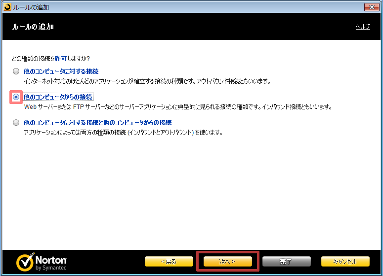 - 「他のコンピュータからの接続」にチェックを付け、[次へ] をクリックします。