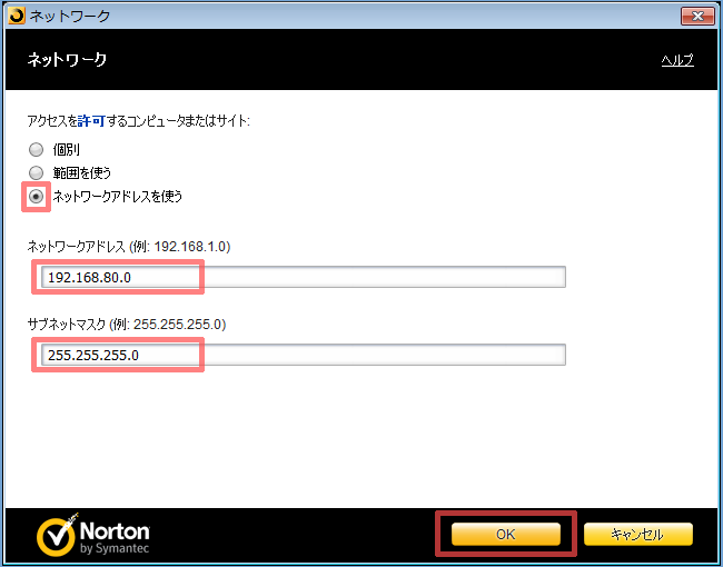 ![「ネットワークアドレスを使う」にチェックを付け、IPアドレス等を入力して、[OK] をクリック](img/n360v5-08s.png)