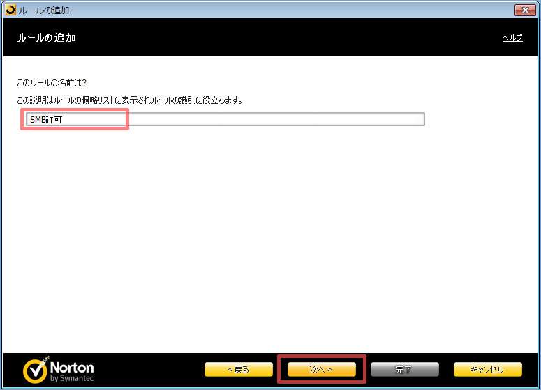 - 入力欄の文字列を「SMB許可」に書き換え、 [次へ] をクリックします。