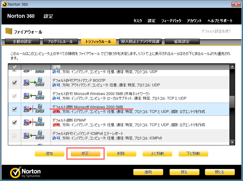 - 次に、ルールの一覧の中から「デフォルト遮断 Microsoft Windows 2000 SMB」を探し、クリックして反転させてから、[修正] をクリックします。